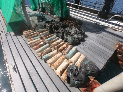 「浦上丸」のERW処理に関しましては、厳しい環境の下ながら作業は着実に進み、前後2つのコンテナの内、前方のコンテナにつきましては、ほとんどのERWの取り出しを完了しました。また、取り出したERWの内の一部(12cm砲弾×13発、薬莢×31個、25cm機関砲弾×2袋、等)を処分場まで移送しました。